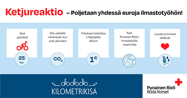 Vappuna jälleen käynnistyvä Kilometrikisa on työnantajille tehokas tapa edistää henkilöstön hyvinvointia ja yhteishenkeä. Leikkimielinen kisa kannustaa vuosittain lähes 40 000 ihmistä ympäri Suomen lisäämään arkiliikuntaa ja vähentämään liikkumisensa päästöjä. Punainen Risti toimii Kilometrikisassa kumppanina ja tarjoaa kisaajille mahdollisuuden tukea pyöräilemällä ilmastonmuutoksen vastaista työtä. Ilmoittautuminen kisaan on käynnissä nyt!