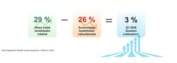 Suomen työnantajien rekrytointiaikeet tammi-maaliskuussa 2026. Kun tuloksesta poistetaan kausivaihtelun vaikutus, indikaattori on 6 %. KUVA: MANPOWERGROUP