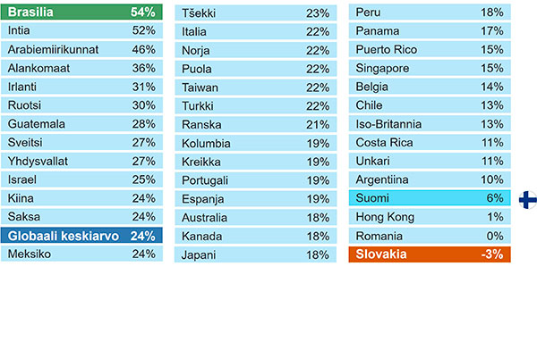 Työnantajien rekrytointiaikeet heikkenevät entisestään. Työnantajien työllistämishalukkuutta kuvaava kausitasoitettu indikaattori on 6 prosenttiyksikköä. Laskua edelliseen vuosineljännekseen on 7 prosenttiyksikköä ja viime vuoden vastaavaan ajanjaksoon 17 prosenttiyksikköä. Globaalisti Suomi sijoittuu työllisyysodotuksissa neljänneksi viimeiseksi, 18 pistettä alle maailman keskiarvon.